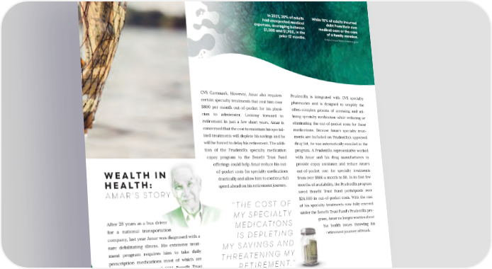 In 2021, 20% of adults While 15% of adults incurred had unexpected medical debt from their own expenses, averaging between medical care or the care $1,000 and $1,900, in the of a family member. prior 12 months. https://www.federalreserve.gov/ CVS Caremark. However, Amar also requires PrudentRx is integrated with CVS specialty certain specialty treatments that cost him over pharmacies and is designed to simplify the $800 per month out-of-pocket for his physi- often-complex process of accessing and uti- cian to administer. Looking forward to lizing specialty medication while reducing or retirement in just a few short years, Amar is eliminating the out-of-pocket costs for these concerned that the cost to maintain his special- medications. Because Amar’s specialty treat- ized treatments will deplete his savings and he ments are included on PrudentRx’s approved will be forced to delay his retirement. The addi- drug list, he was automatically enrolled in the tion of the PrudentRx specialty medication program. A PrudentRx representative worked copay program to the Bene昀椀t Trust Fund with Amar and his drug manufacturers to offerings could help Amar reduce his out- provide copay assistance and reduce Amar’s WEALTH IN of-pocket costs for specialty medications out-of-pocket cost for specialty treatments HEALTH: drastically and allow him to continue full from over $800 a month to $0. In its 昀椀rst few speed ahead on his retirement journey. months of availability, the PrudentRx program AMAR’S STORY saved Bene昀椀t Trust Fund participants over “THE COST OF $24,000 in out-of-pocket costs. With the cost of his specialty treatments now fully covered MY SPECIALTY under the Bene昀椀t Trust Fund’s PrudentRx pro- After 28 years as a bus driver MEDICATIONS gram, Amar no longer worries about for a national transportation his health issues throwing his company, last year Amar was diagnosed with a IS DEPLETING retirement journey off track. rare debilitating illness. His extensive treat- MY SAVINGS AND ment program requires him to take daily prescription medications most of which are THREATENING MY covered by the National IAM Bene昀椀t Trust RETIREMENT.” Fund’s prescription drug program with 05