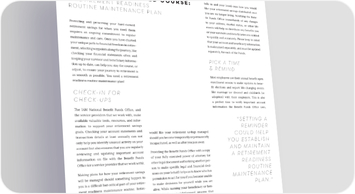 JOURNEY TO RETIREMENT OCTOBER 2022 08 Protecting and preserving your hard-earned retirement savings for when you need them requires an ongoing commitment to regular maintenance and care. Once you have charted your unique path to financial freedom in retire- ment, selecting waypoints along the journey, like checking your financial statements often and keeping your survivor and beneficiary informa - tion up to date, can help you stay the course, or adjust, to ensure your journey to retirement is as smooth as possible. You need a retirement readiness routine maintenance plan! CHECK-IN FOR CHECK-UPS The IAM National Benefit Funds Office, and the service providers that we work with, make available valuable tools, resources, and infor - mation to support your retirement savings goals. Checking your account statements and transaction details at least annually can not only help you identify unusual activity on your account but also ensures that you are regularly reviewing and updating important account information on file with the Benefit Funds Office (or a service provider that we work with). Making plans for how your retirement savings will be managed should something happen to you is a difficult but critical part of your retire - ment readiness maintenance routine. Retire- ment readiness includes identifying how you would like your retirement savings managed should you become temporarily or permanently incapacitated, as well as after you pass away. Providing the Benefit Funds Office with a copy of your fully executed power of attorney (or other legal document authorizing another per - son to make specific legal and financial deci - sions on your behalf) helps us to know who has permission to act for you if you become unable to make decisions for yourself while you are alive. While naming your beneficiary or ben - eficiaries is a straightforward process that tells us and your loved ones how you would like your retirement savings distributed once you are no longer living. Notifying the Bene - fit Funds Office immediately of any changes to your address, marital status, or other life events will help us distribute any benefits you or your survivors and beneficiaries are entitled to quickly and accurately. Please keep in mind that your account and beneficiary information is maintained separately, and must be updated separately, for each of the Funds. PICK A TIME & REMIND Most employees use their annual benefit open enrollment season to make updates to bene - fit elections and report life-changing events like marriage (or divorce) and childbirth (or adoption) with their employers. This is also a perfect time to verify important account information the Benefit Funds Office uses, STAYING THE CHARTED COURSE: A RETIREMENT READINESS ROUTINE MAINTENANCE PLAN NAVIGATING THE WAY "SETTING A REMINDER COULD HELP YOU ESTABLISH AND MAINTAIN A RETIREMENT READINESS ROUTINE MAINTENANCE PLAN."