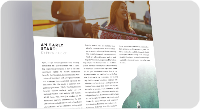 03 Ryen, a high school graduate who recently completed his apprenticeship with a lead - ing engineering company, is now a full-time machinist eligible to receive retirement benefits that his union, the International Asso - ciation of Machinists and Aerospace Workers, and employer have negotiated especially for machinists like him under a collective bar - gaining agreement (“CBA”). The CBA includes benefits options available under the IAM National Pension Fund and the IAM National 401(k) Fund. With Ryen just starting on his retirement journey, understanding the ben - efit options available under each of the Funds allows him to set his retirement savings goals early and watch them grow over the course of his career. Both the Pension Fund and the 401(k) Fund allow for money to be set aside for retire - ment on a tax-advantaged basis, meaning that contributions and earnings to these Funds are allowed to grow tax-free until they are withdrawn, as governed by federal regulations. The Pension Fund is a multiem - ployer defined benefit plan funded entirely by employer contributions negotiated under a CBA, plus investment income. Ryen is not allowed to make any contributions to the Pen - sion Fund and is not responsible for making any decisions about how those employer con - tributions are invested. As a participant in the Pension Fund, once Ryen meets the require - ments for a pension, when he retires, he will be eligible to receive a retirement benefit, typi - cally paid monthly. By contrast, the 401(k) Fund is a multiemployer defined contribution plan funded by both employer and employee contributions. Ryen may elect to have con - tributions deducted from his paycheck on a pre-tax and after-tax basis, as well as choose where those contributions are invested from among several investment options the 401(k) Fund makes available. Along with Social Security and personal savings — such as through the 401(k) Fund — the Pension Fund offers Ryen a valuable retirement income source for years to come. AN EARLY STA RT: RYEN’S STORY