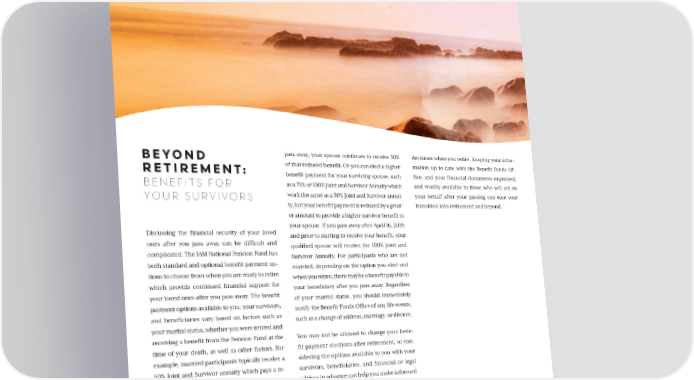Discussing the financial security of your loved ones after you pass away can be difficult and complicated. The IAM National Pension Fund has both standard and optional benefit payment op - tions to choose from when you are ready to retire which provide continued financial support for your loved ones after you pass away. The benefit payment options available to you, your survivors, and beneficiaries vary based on factors such as your marital status, whether you were retired and receiving a benefit from the Pension Fund at the time of your death, as well as other factors. For example, married participants typically receive a 50% Joint and Survivor annuity which pays a re - duced monthly benefit to you so that when you pass away, your spouse continues to receive 50% of that reduced benefit. Or you can elect a higher benefit payment for your surviving spouse, such as a 75% or 100% Joint and Survivor Annuity which work the same as a 50% Joint and Survivor annui - ty, but your benefit payment is reduced by a great - er amount to provide a higher survivor benefit to your spouse. If you pass away after April 16, 2019, and prior to starting to receive your benefit, your qualified spouse will receive the 100% Joint and Survivor Annuity. For participants who are not married, depending on the option you elect and when you retire, there may be a benefit payable to your beneficiary after you pass away. Regardless of your marital status, you should immediately notify the Benefit Funds Office of any life events, such as a change of address, marriage, or divorce. You may not be allowed to change your bene - fit payment elections after retirement, so con- sidering the options available to you with your survivors, beneficiaries, and financial or legal advisor in advance can help you make informed decisions when you retire. Keeping your infor - mation up to date with the Benefit Funds Of - fice, and your financial documents organized, and readily available to those who will act on your behalf after your passing can ease your transition into retirement and beyond. BEYOND RETIREMENT: BENEFITS FOR YOUR SURVIVORS JOURNEY TO RETIREMENT OCTOBER 2022 10