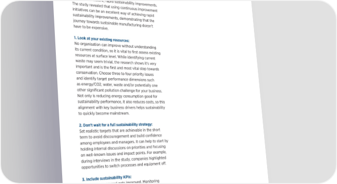 SUSTAINABILITY SPOTLIGHT | 10 Six sustainable actions you can take now 4. Start small: The IfM talked to practitioners from a range of A simple yet e昀昀ective variation is to approach teams global manufacturing 昀椀rms, as well as sustainable that can look straight away at the di昀昀erence between manufacturing experts, to identify common success energy used on good days and bad days. Teams can factors and best practices in businesses that had identify ideas and processes that have been proven achieved consistent, rapid sustainability improvements. to work as they have “been done before”. One The study revealed that using continuous improvement organisational sustainability example achieved over initiatives can be an excellent way of achieving rapid 15% in improvements remotely simply by identifying sustainability improvements, demonstrating that the and acting on performance variation in annual journey towards sustainable manufacturing doesn’t production and resource data. have to be expensive. 5. Get people involved: 1. Look at your existing resources: Wide engagement and commitment were found No organisation can improve without understanding to be the most in昀氀uential factors in achieving its current condition, so it is vital to 昀椀rst assess existing rapid improvements and a successful sustainability resources at surface level. While identifying current transformation in a company. Quick sustainability waste may seem trivial, the research shows it’s very wins can be used to seek top management buy-in important and is the 昀椀rst and most vital step towards by communicating their success in achieving cost conservation. Choose three to four priority issues savings, as well as environmental bene昀椀ts. and identify target performance dimensions such 6. Recognise e昀昀ort and success: as energy/CO2, water, waste and/or potentially one Creating a working environment that recognises and other signi昀椀cant pollution challenge for your business. rewards e昀昀orts towards sustainability improvements Not only is reducing energy consumption good for can help employees at all levels to engage with sustainability performance, it also reduces costs, so this sustainability challenges. It is critical to make alignment with key business drivers helps sustainability employees feel important and at the heart of the to quickly become mainstream. improvement process. 2. Don’t wait for a full sustainability strategy: Set realistic targets that are achievable in the short term to avoid discouragement and build con昀椀dence among employees and managers. It can help to start by Download the full report holding internal discussions on priorities and focusing on well-known issues and impact points. For example, • Discover ways manufacturers during interviews in the study, companies highlighted achieve rapid sustainability opportunities to switch processes and equipment o昀昀. improvements 3. Include sustainability KPIs: • Understand success factors What gets measured gets improved. Monitoring and barriers in progressing metrics that align with sustainability is key to driving sustainability initiatives sustainability improvements through continuous • Receive a checklist with 20 improvement. It’s enough to start small with KPIs, recommendations selecting a few that track the current sustainability to drive resource condition in a cell or facility, such as the use of e昀케ciency electricity, water, coolant or the volume of materials waste. It’s also important to share these metrics often (ideally in real time) with key stakeholders, especially on the shop 昀氀oor, so they can also seek improvements and start to drive those KPIs in the right direction.
