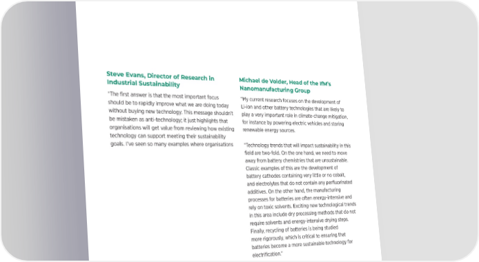 SUSTAINABILITY SPOTLIGHT | 24 Technology perspectives Steve Evans, Director of Research in Michael de Volder, Head of the IfM’s Industrial Sustainability Nanomanufacturing Group “The 昀椀rst answer is that the most important focus “My current research focuses on the development of should be to rapidly improve what we are doing today Li-ion and other battery technologies that are likely to without buying new technology. This message shouldn’t play a very important role in climate-change mitigation, be mistaken as anti-technology; it just highlights that for instance by powering electric vehicles and storing organisations will get value from reviewing how existing renewable energy sources. technology can support meeting their sustainability goals. I’ve seen so many examples where organisations “Technology trends that will impact sustainability in this develop knowledge through this focus, making 昀椀eld are two-fold. On the one hand, we need to move them more prepared and e昀昀ective in selecting new away from battery chemistries that are unsustainable. technology solutions. Classic examples of this are the development of battery cathodes containing very little or no cobalt, “Organisations should also focus on current technology and electrolytes that do not contain any per昀氀uorinated spending plans to ensure that each purchase is as additives. On the other hand, the manufacturing energy/water/material e昀케cient as possible (and/or that processes for batteries are often energy-intensive and it allows for improvement in the future). Most of your rely on toxic solvents. Exciting new technological trends future environmental footprint is decided by existing in this area include dry processing methods that do not technology, so make sure that e昀케ciency is a key require solvents and energy-intensive drying steps. selection criterion so you make choices you are happy Finally, recycling of batteries is being studied to live with in the future. In terms of a trend that aligns more rigorously, which is critical to ensuring that with this, the best place to focus is data innovation – it batteries become a more sustainable technology for o昀昀ers the biggest sustainability improvement for the electri昀椀cation.” least cost, and technologies that support sustainability data insights are rapidly evolving.” Michael de Volder leads the IfM’s Nanomanufacturing Group, which focuses on developing scalable processes Steve Evans leads the IfM’s Sustainability Association. to arrange nanoparticles such as carbon nanotubes The association produced the “Sustainable Innovation: and graphene into well-de昀椀ned superstructures. These Quick Wins in Sustainable Manufacturing” report, may 昀椀nd application in sensors, electronics, catalysis, which recommends how organisations can improve energy storage, water puri昀椀cation and smart materials. sustainability performance quickly without investing heavily in new technologies.