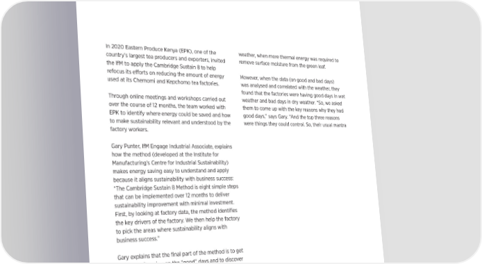 A more sustainable cu瀀瀀a In 2020 Eastern Produce Kenya (EPK), one of the weather, when more thermal energy was required to country’s largest tea producers and exporters, invited remove surface moisture from the green leaf. the IfM to apply the Cambridge Sustain 8 to help refocus its e昀昀orts on reducing the amount of energy However, when the data (on good and bad days) used at its Chemomi and Kepchomo tea factories. was analysed and correlated with the weather, they found that the factories were having good days in wet Through online meetings and workshops carried out weather and bad days in dry weather. “So, we asked over the course of 12 months, the team worked with them to come up with the key reasons why they had EPK to identify where energy could be saved and how good days,” says Gary. “And the top three reasons to make sustainability relevant and understood by the were things they could control. So, their usual mantra factory workers. about ‘it’s all about the weather’ didn’t apply.” Having established drivers for the good days, Gary and his Gary Punter, IfM Engage Industrial Associate, explains team were able to build on simple changes and include how the method (developed at the Institute for sta昀昀 in the journey. Manufacturing’s Centre for Industrial Sustainability) makes energy saving easy to understand and apply Simple steps = big impact because it aligns sustainability with business success: Some of the straightforward actions immediately “The Cambridge Sustain 8 Method is eight simple steps impacted 昀椀rewood and electricity improvements. that can be implemented over 12 months to deliver “Because fuel wood stored in the open has a high sustainability improvement with minimal investment. moisture content,” Gary explains, “we suggested First, by looking at factory data, the method identi昀椀es improving 昀椀rewood storage by expanding covered the key drivers of the factory. We then help the factory wood storage areas. Steam usage was also reduced to pick the areas where sustainability aligns with by eliminating steam leaks and cleaning dust from business success.” radiators and heat exchangers. We also helped to Gary explains that the 昀椀nal part of the method is to get develop an energy dashboard to delve further into the teams focusing on the “good” days and to discover withering and drying. opportunities to build and deliver action plans: “We “To reduce electricity, we encouraged the simple don’t focus on the problems,” says Gary, “but we ask: actions of switching o昀昀 lights and sockets and using What happened on the good days? It’s always more natural lighting instead. At Chemomi, this has reduced motivational to ask them to focus on the ‘good days’ consumption by 25%. within their data and attempt to build on these good periods, rather than solving the bad days.” “In addition, we suggested that tea reworking should Gary goes on to say that when the Sustain 8 method be minimised to avoid additional re-processing energy, asked why energy consumption was higher on some which damages KPIs, and the use of clear roo昀椀ng days than others, the explanation given was the wet sheets to use solar thermal to reduce the moisture of green leaf in the withering troughs.”