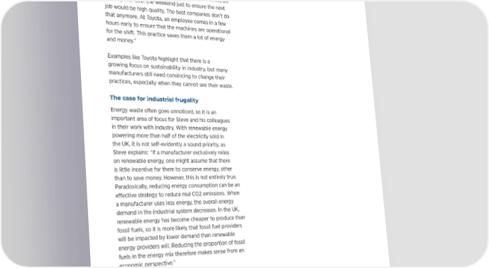 “In even the very best companies, what was considered normal 20 years ago is now seen as absurd,” says Steve. “For example, factories would leave machines on overnight or over the weekend just to ensure the next job would be high quality. The best companies don’t do that anymore. At Toyota, an employee comes in a few hours early to ensure that the machines are operational for the shift. This practice saves them a lot of energy and money.” Examples like Toyota highlight that there is a growing focus on sustainability in industry, but many manufacturers still need convincing to change their practices, especially when they cannot see their waste. The case for industrial frugality A material world Energy waste often goes unnoticed, so it is an Manufacturing serves the purpose of producing important area of focus for Steve and his colleagues material goods for consumers, and industry has the in their work with industry. With renewable energy capacity to do so on a large scale. The sector’s history powering more than half of the electricity sold in of pollution and industry’s connection to consumerism, the UK, it is not self-evidently a sound priority, as however, may lead to the belief that manufacturing is Steve explains: “If a manufacturer exclusively relies incompatible with sustainability. This belief is incorrect on renewable energy, one might assume that there and fails to recognise that food, clothing, medicines, is little incentive for them to conserve energy, other building materials and other essential items are all than to save money. However, this is not entirely true. manufactured goods that we rely on. A sustainable Paradoxically, reducing energy consumption can be an industrial system is necessary to provide these e昀昀ective strategy to reduce real CO2 emissions. When goods to a global population of over 8 billion people. a manufacturer uses less energy, the overall energy Sustainability cannot be delivered by closing down demand in the industrial system decreases. In the UK, industry, which is good news, but we must increase our renewable energy has become cheaper to produce than innovative thinking and implement solutions. fossil fuels, so it is more likely that fossil fuel providers will be impacted by lower demand than renewable “It is hard to come up with general sustainability energy providers will. Reducing the proportion of fossil recommendations for manufacturers because they fuels in the energy mix therefore makes sense from an are so very di昀昀erent. We can’t say, ‘Do this to this economic perspective.” type of machine, do that to your schedule, do this to compressed air.’ But there is hope, because what we With a view of the whole resource system, a frugal 昀椀nd works consistently is to show people that waste is mindset is the only sensible option, according to Steve. happening. Each factory has its own toolkit for dealing Even on the materials side, there is work to be done with waste; we just need to show them that the waste is to make that change: “Material waste should not be there. We 昀椀nd that we don’t have to teach them how to the biggest challenge for manufacturers because it is identify changes that will improve the situation. They’re in their bins. You can physically see material waste if already good at that, and that is really quite important. you bother, but most people don’t bother. Even in our We must teach them how to see the waste so that they homes, waste tends to become psychologically invisible can tackle it,” says Steve. once the bin lid goes down, so we need to be told to look for it.”