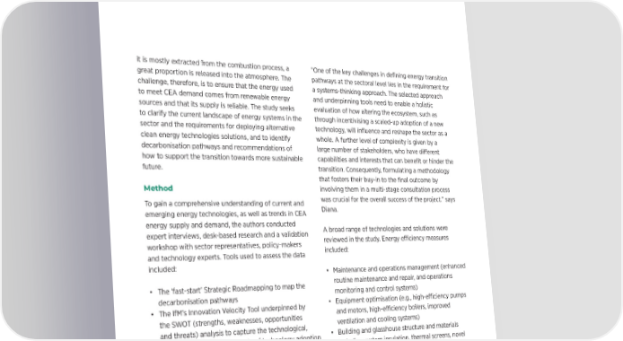 SUSTAINABILITY SPOTLIGHT | 28 it is mostly extracted from the combustion process, a “One of the key challenges in de昀椀ning energy transition great proportion is released into the atmosphere. The pathways at the sectoral level lies in the requirement for challenge, therefore, is to ensure that the energy used a systems-thinking approach. The selected approach to meet CEA demand comes from renewable energy and underpinning tools need to enable a holistic sources and that its supply is reliable. The study seeks evaluation of how altering the ecosystem, such as to clarify the current landscape of energy systems in the through incentivising a scaled-up adoption of a new sector and the requirements for deploying alternative technology, will in昀氀uence and reshape the sector as a clean energy technologies solutions, and to identify whole. A further level of complexity is given by a decarbonisation pathways and recommendations of large number of stakeholders, who have di昀昀erent how to support the transition towards more sustainable capabilities and interests that can bene昀椀t or hinder the future. transition. Consequently, formulating a methodology that fosters their buy-in to the 昀椀nal outcome by Method involving them in a multi-stage consultation process To gain a comprehensive understanding of current and was crucial for the overall success of the project.” says emerging energy technologies, as well as trends in CEA Diana. energy supply and demand, the authors conducted A broad range of technologies and solutions were expert interviews, desk-based research and a validation reviewed in the study. Energy e昀케ciency measures workshop with sector representatives, policy-makers included: and technology experts. Tools used to assess the data included: • Maintenance and operations management (enhanced • The ‘fast-start’ Strategic Roadmapping to map the routine maintenance and repair, and operations decarbonisation pathways monitoring and control systems) • The IfM’s Innovation Velocity Tool underpinned by • Equipment optimisation (e.g., high-e昀케ciency pumps the SWOT (strengths, weaknesses, opportunities and motors, high-e昀케ciency boilers, improved and threats) analysis to capture the technological, ventilation and cooling systems) economic and societal aspects of technology adoption • Building and glasshouse structure and materials • The Marginal Abatement Cost of Carbon (MACC) including system insulation, thermal screens, novel curve to help visualise the cost bene昀椀ts and emissions glazing technologies, and closed- and semi-closed savings of di昀昀erent technologies and solutions for the glasshouses) UK’s CEA sector. • Energy storage (diurnal and seasonal thermal energy storage solutions) Data used in the study was primarily retrieved from • Enhanced crop production through optimised LED Defra, the Climate Change Agreement (CCA) scheme lighting duration and wavelengths, carbon dioxide from the National Farmers Union (NFU) and from management, and selective crop breeding and publicly available documents such as academic articles, genetic modi昀椀cation. grey literature, including White Papers and government documents, and industry reports.
