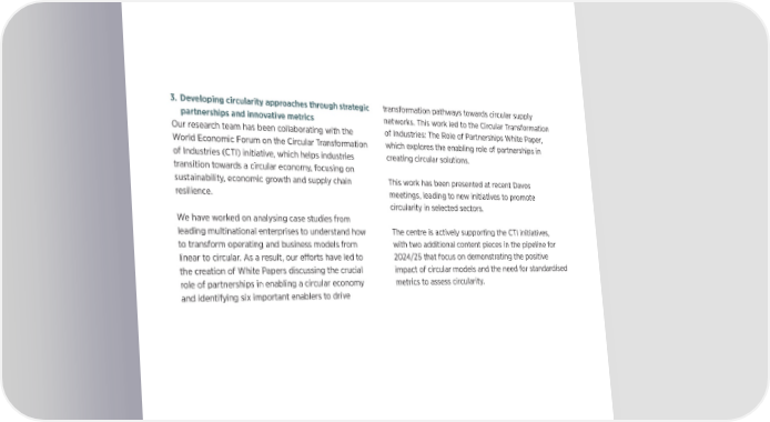 SUSTAINABILITY SPOTLIGHT | 49 Figure 2: Supply Chain Evaluation Source: Srai, J.S. et al Framework for Renewable Feedstocks 2018, ‘Circular supply chains and renewable chemical feedstocks: a network con昀椀guration analysis framework’, Production Planning & Control, 29(6): 464–482. DOI: 10.1080/09537287.20 18.1449263. 3. Developing circularity approaches through strategic transformation pathways towards circular supply partnerships and innovative metrics networks. This work led to the Circular Transformation Our research team has been collaborating with the of Industries: The Role of Partnerships White Paper, World Economic Forum on the Circular Transformation which explores the enabling role of partnerships in of Industries (CTI) initiative, which helps industries creating circular solutions. transition towards a circular economy, focusing on sustainability, economic growth and supply chain This work has been presented at recent Davos resilience. meetings, leading to new initiatives to promote circularity in selected sectors. We have worked on analysing case studies from leading multinational enterprises to understand how The centre is actively supporting the CTI initiatives, to transform operating and business models from with two additional content pieces in the pipeline for linear to circular. As a result, our e昀昀orts have led to 2024/25 that focus on demonstrating the positive the creation of White Papers discussing the crucial impact of circular models and the need for standardised role of partnerships in enabling a circular economy metrics to assess circularity. and identifying six important enablers to drive Figure 3: Circular Transformation Operating and Business Models Source: World Economic Forum 2024, ‘Circular Transformation of Industries: The role of partnerships’. https://www3.weforum.org/docs/WEF_Circular_Transformation_of_Industries_2023.pdf