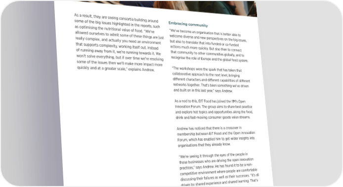 SUSTAINABILITY SPOTLIGHT | 34 As a result, they are seeing consortia building around Embracing community some of the big issues highlighted in the reports, such “We’ve become an organisation that is better able to as optimising the nutritional value of food. “We’ve welcome diverse and new perspectives on the big issues, allowed ourselves to admit some of these things are just but also to translate that into funded or co-funded really complex, and actually you need an environment actions much more quickly. But also then to connect that supports complexity, working itself out. Instead that community to other communities globally, and to of running away from it, we’re running towards it. We recognise the role of Europe and the global food system. won’t solve everything, but if over time we’re resolving some of the issues then we’ll make more impact more “The workshops were the spark that has taken that quickly and at a greater scale,” explains Andrew. collaborative approach to the next level, bringing di昀昀erent characters and di昀昀erent capabilities of di昀昀erent networks together. That’s been something we’ve driven and built on in this last year,” says Andrew. About roadmapping As a nod to this, EIT Food has joined the IfM’s Open Innovation Forum. The group aims to share best practice Roadmapping is a strategic and explore hot topics and opportunities along the food, planning technique that enables the drink and fast-moving consumer goods value streams. development and communication of strategy and innovation. For Andrew has noticed that there is a crossover in more information about the membership between EIT Food and the Open Innovation Forum, which has enabled him to get wider insights into approach, case studies, courses and organisations that they already know. downloadable templates, visit the IfM Engage website. “We’re seeing it through the eyes of the people in those businesses who are driving the open innovation practices,” says Andrew. He has found it to be a non- competitive environment where people are comfortable discussing their failures as well as their successes. “It’s all driven by shared experience and shared learning. That’s supported us in building new and enriching existing relationships with our community,” says Andrew. Andrew concludes: “We’ve emerged signi昀椀cantly stronger as an organisation, both in our sense of purpose and our ability to drive change. The process has led to a fundamentally di昀昀erent quality of attitude and behaviour, which is more open and more collaborative, where we want to work with organisations as peers, not just be at the end of a funding process.”