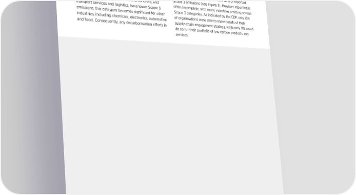 SUSTAINABILITY SPOTLIGHT | 38 Why does Scope 3 matter? these sectors are likely to require intense cooperation Scope 3 emissions can account for more than 70% of among original equipment manufacturers (OEMs), a business’s carbon footprint, based on data from the consumer brand companies and suppliers. UN Global Compact. Figure 2 highlights that di昀昀erent Based on CDP data, Scope 3 category 1 (purchased industries face di昀昀erent Scope 3 situations and goods and services) and Scope 3 category 11 (use of challenges. 1.1 Why does Scope 3 matter? sold products) combined represent 84% of reported While industries such as cement and concrete, and Scope 3 emissions (see Figure 3). However, reporting is transport services and logistics, have lower Scope 3 often incomplete, with many industries omitting several Scope 3 emissions usually account for more than signi昀椀cant for other industries, including chemicals, 6 Scope 3 categories. As indicated by the CDP, only 16% 70% of a business’s carbon footprint. Figure 2 electronics, automotive and food, and as a result emissions, this category becomes signi昀椀cant for other of organisations were able to share details of their highlights that different industries face different any decarbonization efforts in those sectors are industries, including chemicals, electronics, automotive supply-chain engagement strategy, while only 11% could challenges. While industries such as cement and likely to require intense cooperation among original and food. Consequently, any decarbonisation e昀昀orts in concrete, and metals and mining have relatively equipment manufacturers (OEMs), consumer brand do so for their portfolio of low-carbon products and lower Scope 3 emissions, this category becomes companies and their suppliers. services. FIGURE 2 Scope 3 emissions for selected industries from the CDP Cement and concrete Transport services and logistics Paper and pulp Metals and mining Other materials Chemicals Biotech, healthcare and pharma Food and beverage processing Apparel Construction Light manufacturing Transport OEMs Electric and electronic manufacturing Powered machinery 0% 10% 20% 30% 40% 50% 60% 70% 80% 90% 100% Scope 1 Scope 2 Scope 3 Source: Extracted from CDP and Capgemini Invent, From Stroll to Sprint: A Race Against for Corporate Decarbonization, July 2023; CDP, CDP Technical Note: Relevance of Scope 3 Categories by Sector, 2022 According to the CDP report, Scope 3 category categories. Indeed, organizations disproportionately 1 (purchased goods and services) and Scope fail to disclose information about their value-chain 3 category 11 (use of sold products) combined actions.7 Only 16% of organizations were able to represent 84% of reported Scope 3 emissions (see share details of their supply-chain engagement Figure 2. Extracted from World Economic Forum, The “No-Excuse” Opportunities to Figure 3). However, reporting is often incomplete, strategy, while only 11% could do so for their Tackle Scope 3 Emissions in Manufacturing and Value Chains, December 2023. 8 with many industries omitting several Scope 3 portfolio of low-carbon products and services. The “No-Excuse” Opportunities to Tackle Scope 3 Emissions in Manufacturing and Value Chains 9