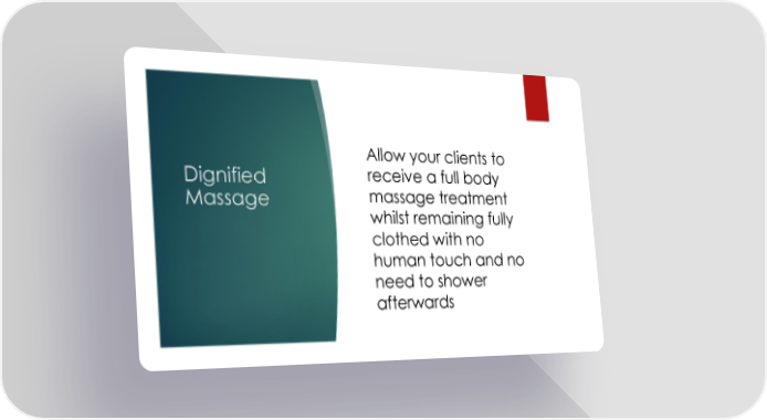 Dignified Massage Allow your clients to receive a full body massage treatment whilst remaining fully clothed with no human touch and no need to shower afterwards