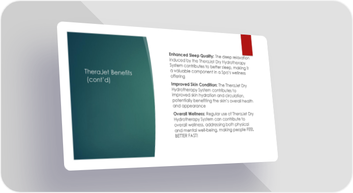 TheraJet Benefits (cont’d) Enhanced Sleep Quality: The deep relaxation induced by the TheraJet Dry Hydrotherapy System contributes to better sleep, making it a valuable component in a Spa’s wellness offering Improved Skin Condition: The TheraJet Dry Hydrotherapy System contributes to improved skin hydration and circulation, potentially benefiting the skin’s overall health and appearance Overall Wellness: Regular use of TheraJet Dry Hydrotherapy System can contribute to overall wellness, addressing both physical and mental well-being, making people FEEL BETTER FAST!