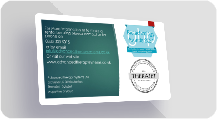 For More information or to make a rental booking please contact us by phone on 0330 333 5015 or by email [email protected] Or visit our website www.advancedtherapysystems.co.uk Advanced Therapy Systems Ltd Exclusive UK Distributor for: TheraJet - SolaJet AquaVive DryCryo