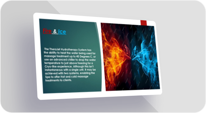Fire & Ice The TheraJet Hydrotherapy System has the ability to heat the water being used for massage treatment up to 40 Degrees C, or use an advanced chiller to drop the water temperature to just above freezing for a Cryo-like experience. Although this isn’t instantaneous with a single unit, it may be achieved with two systems, enabling the Spa to offer Hot and cold massage treatments to clients.