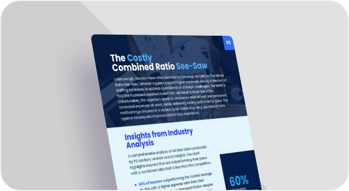 05 A comprehensive analysis of AM Best data conducted by PS Advisory reveals crucial insights. The chart highlights insurers that are outperforming their peers with a combined ratio that is less than the competition. 60% of insurers outperforming the market average do this with a higher expense ratio than their competitors, indicating substantial friction despite strong performance metrics. This higher expense ratio represents higher overall operational expenses. These insurers have benefited from a Combined Ratio See Saw investment that has resulted in a lower loss ratio and lower overall combined ratio than the rest of the market. The friction gap of having a higher expense ratio puts these insurers at risk of doing worse than their competitors during any significant market change. Having a less efficient organization leads to the assumption that these companies are also less flexible (due to higher levels of manual processing and legacy infrastructure) and will not be able to adjust quickly to changes in the market or shifts in go to market strategy. Unknowingly, insurers have often resorted to a strategy we call the "Combined Ratio See-Saw," wherein insurers support higher expenses, usually in the form of staffing increases, to address operational or strategic challenges. The belief is that the increased expense investment will result in lower loss ratios. Unfortunately, this approach leads to temporary relief at best and permanent increased expenses at worst, rarely delivering lasting performance gains. This method traps insurers in a vicious cycle, balancing rising operational costs against inadequate improvements in loss experience.. The Costly Combined Ratio See-Saw Insights from Industry Analysis Source: AM Best data Bridging the Friction Gap: Revolutionizing P&C Insurance Operations 60% of insurers outperforming the market average do this with a higher expense ratio than their competitors