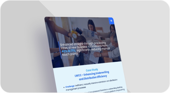 10 Case Study LWCC - Enhancing Underwriting and Distribution Efficiency Challenge: Inefficient, manually intensive submission and distribution management processes Solution: Implementation of an advanced Salesforce underwriting desktop, integrated broker portal, and distribution management platform empowering field managers. Impact: Submission processing time reduced dramatically from 30 minutes to 90 seconds Enhanced straight-through processing rates of new business submissions from 40% to 71%, significantly reducing manual touch points Automated endorsement processing increased from 0% to 40% and growing. Manual producer visit reports taking 2-3 hours each replaced with generated reports taking 15-20 minutes that include a shareable Report summary, on line visit documentation and follow on task management Enhanced straight-through processing rates of new business submissions from 40% to 71%, significantly reducing manual touch points Bridging the Friction Gap: Revolutionizing P&C Insurance Operations