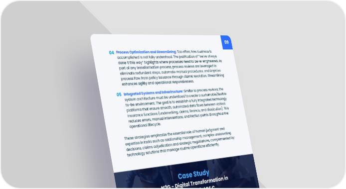 Case Study N2G - Digital Transformation in Commercial P&C 09 These strategies emphasize the essential role of human judgment and expertise in tasks such as relationship management, complex underwriting decisions, claims adjudication and strategic negotiations, complemented by technology solutions that manage routine operations efficiently. Process Optimization and Streamlining: Too often, how business is accomplished is not fully understood. The justification of “we’ve always done it this way” highlights where processes need to be re-engineered. As part of any transformation process, process reviews are leveraged to eliminate redundant steps, automate manual procedures, and improve process flow from policy issuance through claims resolution. Streamlining enhances agility and operational responsiveness. 04 Integrated Systems and Infrastructure: Similar to process reviews, the system architecture must be understood to create a sustainable/flexible to-be environment. The goal is to establish a fully integrated technology platforms that ensure smooth, automated data flows between various insurance functions (underwriting, claims, finance, and distribution). This reduces errors, manual interventions, and friction points throughout the operational lifecycle. 05 Challenge: Operational complexity arising from multiple, disconnected underwriting systems and consolidating very disparate underwriting programs into a single offering. Solution: Consolidation of seven platforms into three integrated into a Salesforce-powered, end to end cohesive environment. Impact: Over 1,000 hours saved annually by significantly reducing redundant data entry tasks 25% improvement in underwriting accuracy and documentation consistency Bridging the Friction Gap: Revolutionizing P&C Insurance Operations