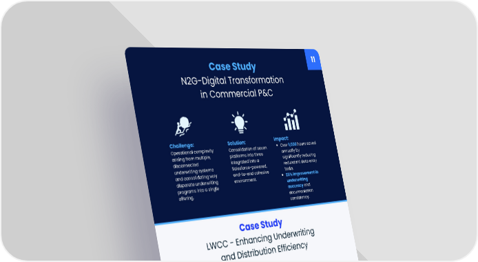 Solution: Implementation of an advanced Salesforce underwriting desktop, integrated broker portal, and distribution management platform empowering field managers. Impact: Submission processing time reduced dramatically from 30 minutes to 90 seconds. Enhanced straight-through processing rates of new business submissions from 40% to 71%, significantly reducing manual touchpoints. Automated endorsement processing increased from 0% to 40% and growing. Manual producer visit reports taking 2-3 hours each replaced with generated reports taking 15-20 minutes that include a shareable Report summary, on line visit documentation and follow-on task management. 11 Case Study N2G-Digital Transformation in Commercial P&C Challenge: Operational complexity arising from multiple, disconnected underwriting systems and consolidating very disparate underwriting programs into a single offering. Solution: Consolidation of seven platforms into three integrated into a Salesforce-powered, end-to-end cohesive environment. Impact: Over 1,000 hours saved annually by significantly reducing redundant data entry tasks. 25% improvement in underwriting accuracy and documentation consistency. Case Study LWCC - Enhancing Underwriting and Distribution Efficiency Challenge: Inefficient, manually intensive submission and distribution management processes. PS ADVISORY: Closing the Friction Gap