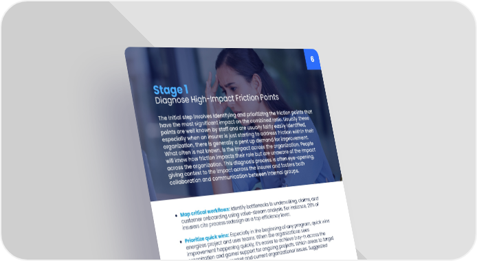 Map critical workflows: Identify bottlenecks in underwriting, claims, and customer onboarding using value-stream analysis. For instance, 26% of insurers cite process redesign as a top efficiency lever. Prioritize quick wins: Especially in the beginning of any program, quick wins energizes project and user teams. When the organizations sees improvement happening quickly, it’s easier to achieve buy-in across the organization and garner support for ongoing projects. Which areas to target will vary by insurer, market and current organizational issues. Suggested target areas with immediate ROI: Automate claims triage Automate submission intake processing and testing (In good order, appetite and clearance testing) Leverage analytics and artificial intelligence (AI) to review and stack rank submissions to prioritize underwriting appeal. Identify and implement digital technology that can speed processing, such as AI Vision to augment OCR processing of submitted PDFs. Identify transactions that can leverage straight-through processing such as commodity or clean underwriting submissions. Identify distribution management functionality that would improve agent/broker relationships Identify leakage points in both underwriting and claims. Identify new channels that would be more likely to delight third parties such as agentic processing. Stage 1 Diagnose High-Impact Friction Points PS ADVISORY: Closing the Friction Gap The initial step involves identifying and prioritizing the friction points that have the most significant impact on the combined ratio. Usually these points are well known by staff and are usually fairly easily identified, especially when an insurer is just starting to address friction within their organization, there is generally a pent up demand for improvement. What often is not known, is the impact across the organization. People will know how friction impacts their role but are unaware of the impact across the organization. This diagnosis process is often eye-opening, giving context to the impact across the insurer and fosters both collaboration and communication between internal groups. 6
