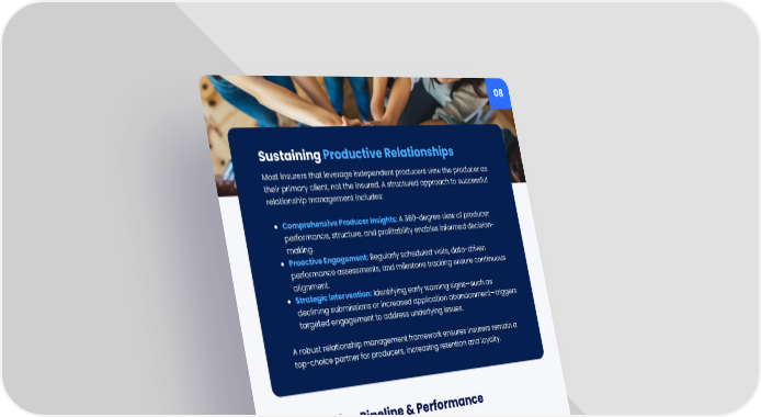 Most insurers that leverage independent producers view the producer as their primary client, not the insured. A structured approach to successful relationship management includes: Comprehensive Producer Insights: A 360-degree view of producer performance, structure, and profitability enables informed decision- making. Proactive Engagement: Regularly scheduled visits, data-driven performance assessments, and milestone tracking ensure continuous alignment. Strategic Intervention: Identifying early warning signs—such as declining submissions or increased application abandonment—triggers targeted engagement to address underlying issues. A robust relationship management framework ensures insurers remain a top-choice partner for producers, increasing retention and loyalty. Sustaining Productive Relationships A sustainable distribution strategy requires continuous pipeline monitoring and proactive execution. Key considerations include: Pipeline Health Analysis: Evaluating submission volume, quality, hit ratios and profitability trends informs strategic adjustments. Issue Resolution: Addressing underwriting bottlenecks, submission inconsistencies, and profitability shifts preserves business momentum. Speed & Transparency: Adopting a “Get to No Faster” philosophy ensures prompt responses, preventing unnecessary delays and maintaining producer trust. Insurers that effectively manage their producer pipeline gain a competitive advantage by ensuring efficiency and predictability in new business acquisition. Optimizing Pipeline & Performance Management 08 PS ADVISORY: White Paper