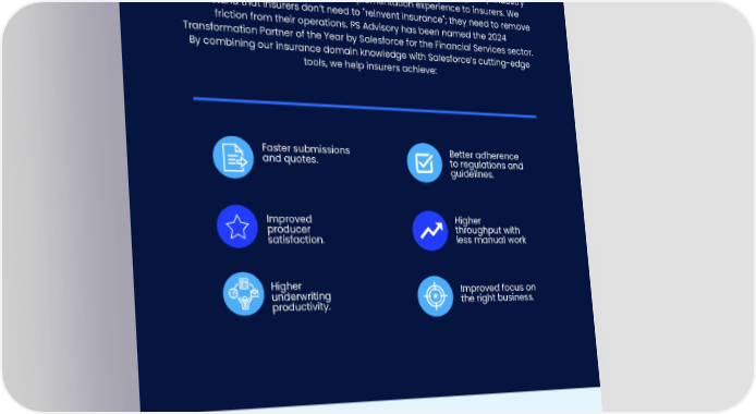 13 The PS Advisory Difference: Reducing Friction with Salesforce At PS Advisory, we only focus on the insurance industry. We bring deep industry expertise and proven Salesforce implementation experience to insurers. We understand that insurers don’t need to "reinvent insurance"; they need to remove friction from their operations. PS Advisory has been named the 2024 Transformation Partner of the Year by Salesforce for the Financial Services sector. By combining our insurance domain knowledge with Salesforce’s cutting-edge tools, we help insurers achieve: Faster submissions Better adherence and quotes. to regulations and guidelines. Improved Higher producer throughput with satisfaction. less manual work Higher Improved focus on underwriting the right business. productivity. Our work with N2G, LWCC, and other leading insurers proves that these results are achievable today. WINNER © 2025 PS Advisory. All rights reserved
