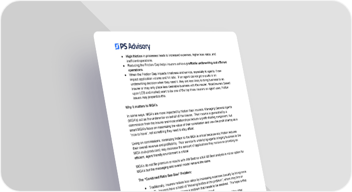 ● High friction in processes leads to increased expenses, higher loss ratios, and inefficient operations. ● Reducing the Friction Gap helps insurers achieve profitable underwriting and efficient operations . ● When the Friction Gap impacts timeliness and service, especially to agents, it can impact application volume and hit ratio. If an agent cannot get a quote or an underwriting decision when they need it, they are less likely to bring business to an insurer or may only place less desirable business with the insurer. Most insurers (based upon LOB and market) want to be one of the top three insurers an agent uses, friction issues may jeopardize this. Why it matters to MGA’s In some ways, MGA’s are more impacted by friction than insurers. Managing General Agents (MGA’s) act as the underwriter on behalf of the insurer. Their income is generated by a commission from the insurer and most relationships include a profit sharing component, but smart MGA’s focus on maximizing the value of their commission and view the profit sharing as a “nice to have”, not something they need to stay afloat. Living on commissions, minimizing friction to the MGA is critical because any friction reduces their overall revenue and profitability. Poor service to underlying agents bringing business to the MGA (sub-producers) may decrease the amount of applications they receive so providing an efficient, agent friendly environment is critical MGA’s do not file premium or results with AM Best so a full AM Best analysis is not an option for MGA’s but the messaging and overall model remains the same. The “Combined Ratio See-Saw” Problem: ● Traditionally, insurers reduce loss ratios by increasing expenses (usually by hiring more staff). Insurers have a habit of “throwing bodies at the problem”, where they hire or assign more people to address a problem that needs to be resolved. The hope is that this will improve loss results but this is not guaranteed. ● This creates a see-saw effect , where one ratio improves at the cost of the other. ● Technology & automation offer a way to reduce friction without increasing costs. Insurers can get off the Combined Ratio See Saw by investing in solutions like Salesforce that can help them improve results while keeping major costs (such as headcount) flat