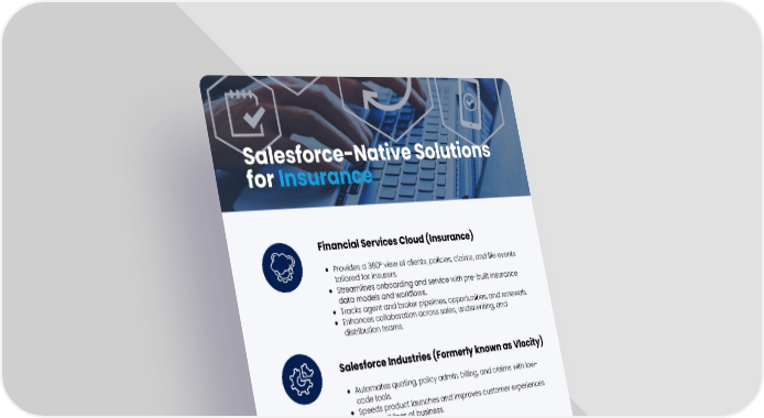 Financial Services Cloud (Insurance) Provides a 360° view of clients, policies, claims, and life events tailored for insurers. Streamlines onboarding and service with pre-built insurance data models and workflows. Tracks agent and broker pipelines, opportunities, and renewals. Enhances collaboration across sales, underwriting, and distribution teams. Salesforce Industries (Formerly known as Vlocity) Automates quoting, policy admin, billing, and claims with low- code tools. Speeds product launches and improves customer experiences across all lines of business. Distribution Management (Agent & Broker Force) Centralizes licensing, appointments, commissions, and performance tracking. Supports broker engagement, marketing campaigns, and meeting scheduling. Experience Cloud (Portals) Delivers self-service portals for policyholders, agents, and brokers. Reduces service costs while improving access to claims, policies, and renewals. Salesforce-Native Solutions for Insurance Your Trusted Salesforce Consulting Partner in Insurance