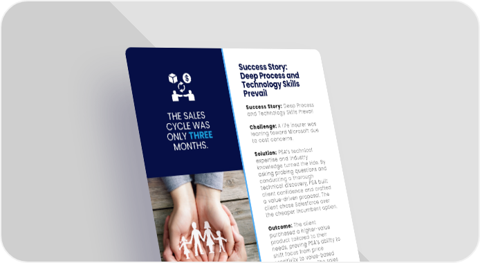 THE SALES CYCLE WAS ONLY THREE MONTHS. Success Story: Deep Process and Technology Skills Prevail Success Story: Deep Process and Technology Skills Prevail Challenge: A life insurer was leaning toward Microsoft due to cost concerns. Solution: PSA’s technical expertise and industry knowledge turned the tide. By asking probing questions and conducting a thorough technical discovery, PSA built client confidence and crafted a value-driven proposal. The client chose Salesforce over the cheaper incumbent option. Outcome: The client purchased a higher-value product tailored to their needs, proving PSA’s ability to shift focus from price sensitivity to value-based decision-making. The sales cycle was only 3 months. Takeaway Involve PSA early in your sales cycle early to gain client confidence, improve your chances of success, close deals faster, and secure higher contract values. Your Trusted Salesforce Consulting Partner in Insurance