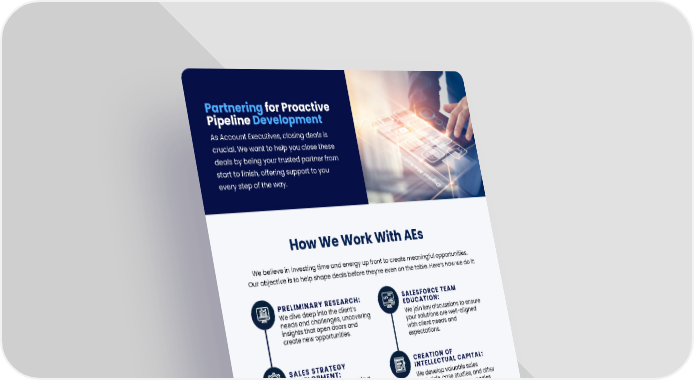 How We Work With AEs Partnering for Proactive Pipeline Development As Account Executives, closing deals is crucial. We want to help you close these deals by being your trusted partner from start to finish, offering support to you every step of the way. PRELIMINARY RESEARCH: We dive deep into the client’s needs and challenges, uncovering insights that open doors and create new opportunities. SALES STRATEGY DEVELOPMENT: Working together, we create a tailored sales approach that speaks directly to your target audience and aligns with their business goals. OUTREACH SUPPORT: From initiating contact to nurturing relationships, we’re here to help build momentum and ensure the conversation stays on track. SALESFORCE TEAM EDUCATION: We empower your team with the tools and knowledge they need at every stage, so they’re equipped to succeed. SALESFORCE TEAM EDUCATION: We join key discussions to ensure your solutions are well-aligned with client needs and expectations. CREATION OF INTELLECTUAL CAPITAL: We develop valuable sales materials, case studies, and other resources to support your sales cycles and strengthen your positioning. BENEFIT ANALYSIS: We collaborate to clearly communicate the specific benefits of your solution in a way that resonates with decision-makers. DEMO DEVELOPMENT SUPPORT: We help craft and tailor impactful product demos that showcase the full potential of your solution. We believe in investing time and energy up front to create meaningful opportunities. Our objective is to help shape deals before they’re even on the table. Here’s how we do it: Your Trusted Salesforce Consulting Partner in Insurance