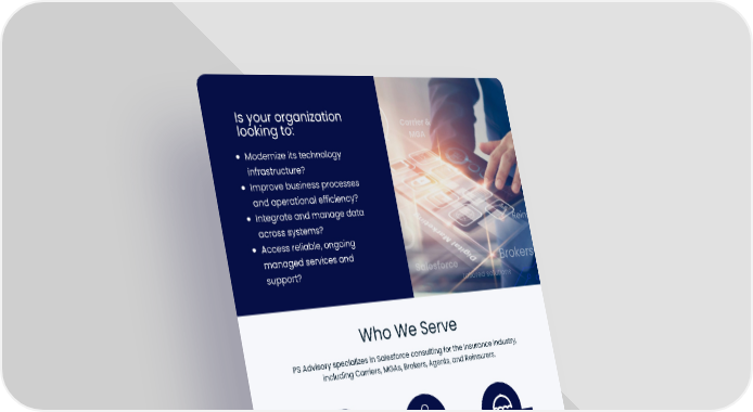 Is your organization Carrier & looking to: MGA Modernize its technology infrastructure? Improve business processes and operational efficiency? Integrate and manage data Reins across systems? Access reliable, ongoing managed services and Brokers support? Salesforce tailored solutions Cloud Who We Serve PS Advisory specializes in Salesforce consulting for the Insurance industry, including Carriers, MGAs, Brokers, Agents, and Reinsurers. Agency and Reinsurers Carrier & MGA Broker Engagement Business Process Lead and Pipeline tracking Engineering Management Cedent and Distribution Agency AMS data Broker Management integration Relationship Insurance Portals Marketing Management Process SF consulting for Business Process Automation brokers consulting Insurance Data & Analytics & Data Insights integration BRIEF: ABOUT PS ADVISORY