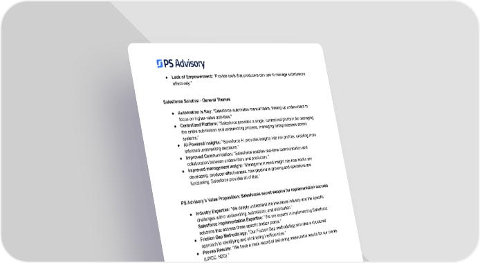 ● Lack of Empowerment: "Provide tools that producers can use to manage submissions effectively." Salesforce Solution - General Themes ● Automation is Key: "Salesforce automates manual tasks, freeing up underwriters to focus on higher-value activities." ● Centralized Platform: "Salesforce provides a single, centralized platform for managing the entire submission and underwriting process, managing data/processes across systems." ● AI-Powered Insights: "Salesforce AI provides insights into risk profiles, enabling more informed underwriting decisions." ● Improved Communication: "Salesforce enables real-time communication and collaboration between underwriters and producers." ● Improved management insight: “Management need insight into how books are developing, producer effectiveness, how pipeline is growing and operations are functioning, Salesforce provides all of that.” PS Advisory's Value Proposition: Salesforces secret weapon for implementation success ● Industry Expertise: "We deeply understand the insurance industry and the specific challenges within underwriting, submission, and distribution." Salesforce Implementation Expertise: "We are experts in implementing Salesforce solutions that address these specific friction points." ● Friction Gap Methodology: "Our Friction Gap methodology provides a structured approach to identifying and eliminating inefficiencies." ● Proven Results: "We have a track record of delivering measurable results for our clients (LWCC, N2G)." Key Questions to Spark Conversation ● "How much time do your underwriters spend on manual data entry?" ● "Are you confident you're capturing all available business?" ● "Are your producers happy with your current process?" PSA Contacts ● Andrew Bartels: abartels@psadvisory.com , 443-742-4672 ● Bruce Olson: bolson@psadvisory.com , 303-775-7117 ● Tom King: tking@psadvisory.com , 973-747-8703