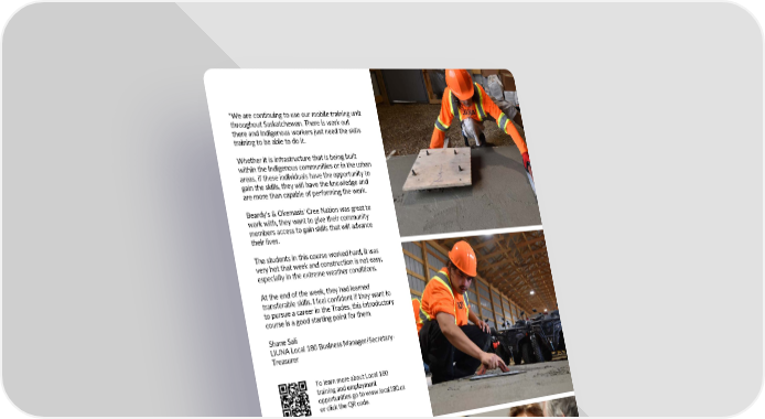 "We are continuing to use our mobile training unit throughout Saskatchewan. There is work out there and Indigenous workers just need the skills training to be able to do it. Whether it is infrastructure that is being built within the Indigenous communities or in the urban areas, if these individuals have the opportunity to gain the skills, they will have the knowledge and are more than capable of performing the work. Beardy's & Okemasis' Cree Nation was great to work with, they want to give their community members access to gain skills that will advance their lives. The students in this course worked hard, it was very hot that week and construction is not easy, especially in the extreme weather conditions. At the end of the week, they had learned transferable skills. I feel confident if they want to to pursue a career in the Trades, this introductory course is a good starting point for them. Shane Sali LIUNA Local 180 Business Manager/Secretary- Treasurer To learn more about Local 180 training and employment opportunities go to www.local180.ca or click the QR code. 25 2 0 E U S S I | 4 2 0 2 R E B M E T P E S