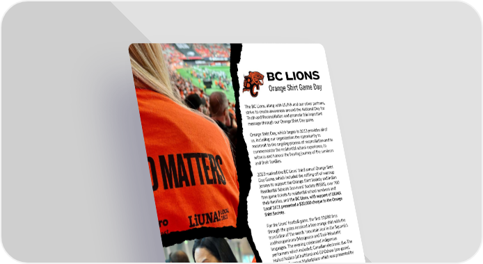 34 BC LIONS Orange Shirt Game Day The BC Lions, along with LIUNA and our other partners, strive to create awareness around the National Day for Truth and Reconciliation and promote this important message through our Orange Shirt Day game. Orange Shirt Day, which began in 2013 provides all of us, including our organization the opportunity to recommit to the ongoing process of reconciliation and to commemorate the residential school experience, to witness and honour the healing journey of the survivors and their families. 2023 marked the BC Lions’ third annual Orange Shirt Day Game, which included the raffling off of warmup jerseys to support the Orange Shirt Society and Indian Residential Schools Survivors’ Society (IRSSS), over 700 free game tickets to residential school survivors and their families, and the BC Lions, with support of LIUNA Local 1611 presented a $20,000 cheque to the Orange Shirt Society. For the Lions’ football game, the first 10,000 fans through the gates received a free orange shirt with the translation of the words ‘mountain lion’ in the Squamish and hənqəminəm (Musqueam and Tseil-Waututh) languages. The evening celebrated Indigenous performers which included; Canadian electronic duo The Halluci Nation (at halftime) and DJ Oshow (pre-game), and an Indigenous Marketplace which was presented by Destination Indigenous. “As an Organization, we feel it is important to broaden our own understanding of the painful history and ongoing impacts of residential 12 schools and will continue to do all we can within our football community.” 2 0 E U JAMIE TARAS S S I Director Community Partnerships | 4 2 0 2 Learn how to pronounce mountain lion in R hən̓ q̓ əmin̓ əm̓ , the language of the Musqueam E B and Tsleil-Waututh Nations. M E T P SCAN the QR CODE E S