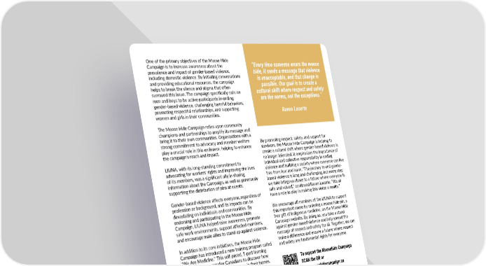 One of the primary objectives of the Moose Hide Campaign is to increase awareness about the “Every time someone wears the moose prevalence and impact of gender-based violence, hide, it sends a message that violence including domestic violence. By initiating conversations is unacceptable, and that change is and providing educational resources, the campaign possible. Our goal is to create a helps to break the silence and stigma that often cultural shift where respect and safety surround this issue. The campaign specifically calls on men and boys to be active participants in ending are the norms, not the exceptions.” gender-based violence, challenging harmful behaviors, promoting respectful relationships, and supporting Raven Lacerte women and girls in their communities. The Moose Hide Campaign relies upon community champions and partnerships to amplify its message and bring it to their own communities. Organizations with a strong commitment to advocacy and member welfare By promoting respect, safety, and support for play a crucial role in this endeavor, helping to enhance survivors, the Moose Hide Campaign is helping to the campaign's reach and impact. create a cultural shift where gender-based violence is no longer tolerated. It emphasizes the importance of LIUNA, with its long-standing commitment to individual and collective responsibility in ending advocating for workers' rights and improving the lives violence and building a society where everyone can live of its members, was a significant ally in sharing free from fear and harm. “The journey to end gender- information about the Campaign, as well as generously based violence is long and challenging, but every step supporting the distribution of pins at events. we take brings us closer to a future where everyone is safe and valued,” continued Raven Lacerte. “We all Gender-based violence affects everyone, regardless of have a role to play in making this vision a reality.” profession or background, and its impacts can be devastating on individuals and communities. By We encourage all members of the LIUNA to support endorsing and participating in the Moose Hide this important cause by ordering a moose hide pin, a Campaign, LIUNA helped raise awareness, promote free gift of Indigenous medicine, on the Moose Hide safe work environments, support affected members, Campaign website. By doing so, you take a stand and encourage male allies to stand up against violence. against gender-based violence and help spread the message of respect and safety for all. Together, we can In addition to its core initiatives, the Moose Hide make a difference and ensure a future where respect Campaign has introduced a new training program called and safety are fundamental rights for everyone. "We Are Medicine." This self-paced, 5-part learning journey invites everyday Canadians to discover how To support the Moosehide Campaign they can be medicine to end violence in their homes, communities, and workplaces. The program offers SCAN the QR or practical guidance supported by 90 minutes of video visit: moosehidecampaign.ca content led by Indigenous Wisdom Carriers from across Turtle Island and the Moose Hide Campaign. "We Are Medicine" empowers individuals with the knowledge and tools to contribute to ending violence in Canada. 31 2 0 E U S S I | 4 2 0 2 R E B M E T P E S