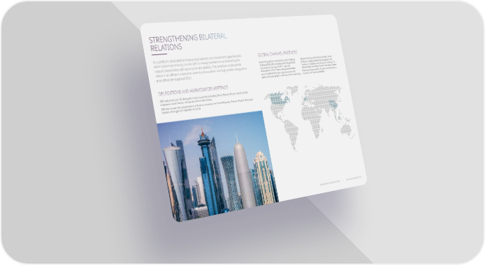 | QFC ANNUAL REPORT 2023 STRENGTHENING BILATERAL RELATIONS As a platform dedicated to showcasing business and investment opportunities within Qatars promising market, QFC is heavily invested in consolidating the nations bilateral ties with key economies globally. This ambition continued to reflect in its efforts to welcome several ambassadors and high-profile delegations at its offices throughout 2023. QFC welcomed over 30 delegations from countries including China, France, Russia, Saudi Arabia, Singapore, South Korea, Trkiye and the United States. QFC also hosted the ambassadors of Austria, Australia, the Czech Republic, France, Poland, Portugal, Sweden, Portugal and Tajikistan to Qatar. DELEGATIONS AND AMBASSADOR MEETINGS GLOBAL CHANNEL PARTNERS Expanding global connections and fortifying relationships with existing channel partners remained at the top of QFCs agenda throughout 2023. Eleven new partnerships were established in key regions across the globe, bolstering QFCs leading role in nurturing alliances locally and internationally. Some of these include Enterprise Singapore, HK Trade and Development Council, Institute for Information Industry, Taiwan, Malaysia Digital Economy Corporation, Canada Arab Business Council, and German BVMW. BROADENING A GLOBAL NETWORK
