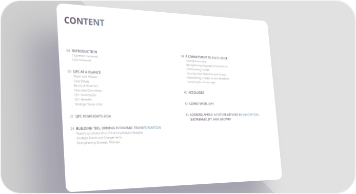 34 A COMMITMENT TO EXCELLENCE Fuelling Innovation Strengthening Regulatory Environment Championing Clients Securing Data Protection and Privacy Empowering a Values-Driven Workforce Nurturing the Community 40 ACCOLADES 42 CLIENT SPOTLIGHT 44 LOOKING AHEAD: A FUTURE DEFINED BY INNOVATION, SUSTAINABILITY, AND GROWTH 04 INTRODUCTION Chairman Foreword CEO Foreword 08 QFC AT A GLANCE Vision and Mission Core Values Board of Directors Executive Committee QFC Governance QFC Benefits Strategic Vision 2030 22 QFC HIGHLIGHTS 2024 24 BUILDING TIES, DRIVING ECONOMIC TRANSFORMATION Fostering Collaboration, Enhancing Industry Insights Strategic Events and Engagements Strengthening Strategic Alliances CONTENT