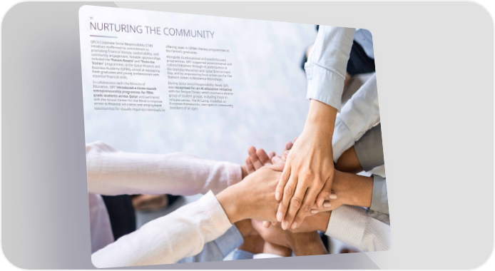 39 40 NURTURING THE COMMUNITY QFCs Corporate Social Responsibility (CSR) initiatives reaffirmed its commitment to promoting financial literacy, sustainability, and community engagement. Notable sponsorships included the Future Assets and Train the Trainer programmes at the Qatar Finance and Business Academy (QFBA), aimed at equipping fresh graduates and young professionals with essential financial skills. In collaboration with the Ministry of Education, QFC introduced a three-month entrepreneurship programme for fifth- grade students across Qatar and partnered with the Alnoor Center for the Blind to improve access to financial education and employment opportunities for visually impaired individuals by 40 39 offering seats in QFBAs literacy programmes to the Centres graduates. Alongside its educational and youth-focused programmes, QFC supported environmental and cultural initiatives through its participation in the Ooredoo Marathon and Qatar Environment Day, and by empowering local artists via the Fire Stations Artists in Residence Workshops. During Qatar Social Responsibility Week, QFC was recognised for an AI education initiative with the Imtiyaz Center, which reached a diverse group of student groups, including those in refugee camps. The AI Camp, modelled on European frameworks, was open to community members of all ages.