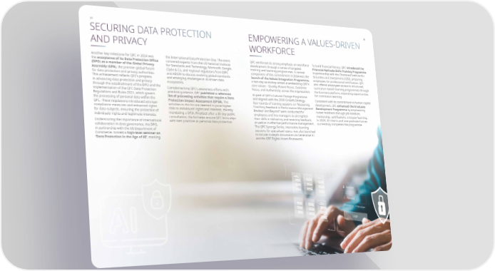 37 38 Another key milestone for QFC in 2024 was the acceptance of its Data Protection Office (DPO) as a member of the Global Privacy Assembly (GPA) , the premier global forum for data protection and privacy authorities. This achievement reflects QFCs progress in advancing data protection and privacy through the establishment of the DPO and the implementation of the QFC Data Protection Regulations and Rules 2021, which govern the processing of personal data within the QFC. These regulations introduced stronger compliance measures and enhanced rights for data subjects, ensuring the protection of individuals rights and legitimate interests. Underscoring the importance of international collaboration in data governance, the DPO, in partnership with the US Department of Commerce, hosted a high-level seminar on Data Protection in the Age of AI , marking QFC reinforced its strong emphasis on workforce development through a series of targeted training and learning programmes. A central component of this commitment in 2024 was the launch of the Values Integration Programme , a two-day workshop aimed at embedding QFCs core valuesQuality, Future Focus, Customer Focus, and Authenticity across the organisation. As part of QFCs Cultural Change Programme and aligned with the 2030 Growth Strategy, four rounds of training sessions on Mastering Coaching Feedback in Performance Management Reviews and Beyond were conducted for employees and line managers to strengthen their skills in delivering and receiving feedback, as well as in effective performance management. The QFC Synergy Series, interactive learning sessions for specialised topics, was also launched to include in-depth discussions on Generative AI and the QFC Digital Assets Framework. the International Data Protection Day. The event convened experts from the US National Institute for Standards and Technology, Microsoft, Google, Clyde & Co, and regional regulators from DIFC and ADGM to discuss evolving global standards and emerging challenges in AI-driven data ecosystems. Complementing QFCs awareness efforts with practical guidance, QFC published a reference list of processing activities that require a Data Protection Impact Assessment (DPIA) . The activities in this list are deemed to pose higher risks to individuals rights and interests, thereby mandating a DPIA. Finalised after a 30-day public consultation, the list helps ensure QFC firms align with best practices in personal data protection. To build financial literacy, QFC introduced the Financial Aptitude Skills Training Programme in partnership with the Chartered Institute for Securities and Investments (CISI), preparing employees for professional certification. QFC also offered employees access to structured, curriculum-based learning programmes through the Coursera platform, expanding opportunities for continuous learning. Consistent with its commitment to human capital development, QFC enhanced the Graduate Development Programme by emphasising career readiness through job rotations, mentorship, certifications, and peer learning. In 2024, 33 interns and one graduate trainee successfully completed the programme. SECURING DATA PROTECTION AND PRIVACY EMPOWERING A VALUES-DRIVEN WORKFORCE 38 37