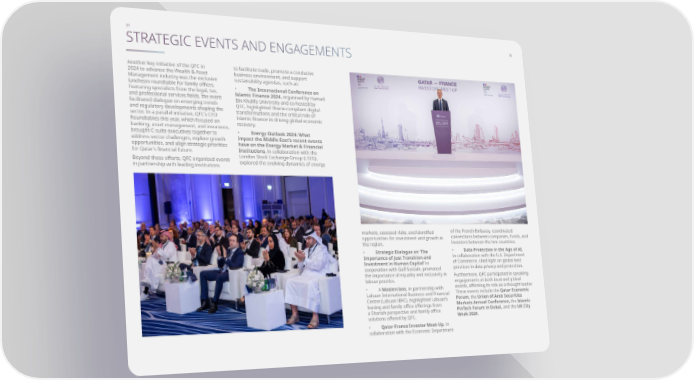 31 32 Another key initiative of the QFC in 2024 to advance the Wealth & Asset Management industry was the exclusive luncheon roundtable for family offices. Featuring specialists from the legal, tax, and professional services fields, the event facilitated dialogue on emerging trends and regulatory developments shaping the sector. In a parallel initiative, QFCs CEO Roundtables this year, which focused on banking, asset management, and insurance, brought C-suite executives together to address sector challenges, explore growth opportunities, and align strategic priorities for Qatars financial future. Beyond these efforts, QFC organised events in partnership with leading institutions to facilitate trade, promote a conducive business environment, and support sustainability agendas, such as: The International Conference on Islamic Finance 2024, organised by Hamad Bin Khalifa University and co-hosted by QFC, highlighted Sharia-compliant digital transformations and the critical role of Islamic finance in driving global economic recovery. Energy Outlook 2024: What impact the Middle Easts recent events have on the Energy Market & Financial Institutions , in collaboration with the London Stock Exchange Group (LSEG), explored the evolving dynamics of energy markets, assessed risks, and identified opportunities for investment and growth in the region. Strategic Dialogue on The Importance of Just Transition and Investment in Human Capital in cooperation with Gulf Sustain, promoted the importance of equality and inclusivity in labour practice. A Masterclass , in partnership with Labuan International Business and Financial Centre (Labuan IBFC), highlighted Labuans leasing and family office offerings from a Shariah perspective and family office solutions offered by QFC. Qatar-France Investor Meet-Up , in collaboration with the Economic Department of the French Embassy, coordinated connections between companies, funds, and investors between the two countries. Data Protection in the Age of AI, in collaboration with the U.S. Department of Commerce, shed light on global best practices in data privacy and protection. Furthermore, QFC participated in speaking engagements at both local and global events, affirming its role as a thought leader. These events include the Qatar Economic Forum, the Union of Arab Securities Markets Annual Conference, the Islamic FinTech Forum in Dubai, and the UK City Week 2024 . STRATEGIC EVENTS AND ENGAGEMENTS