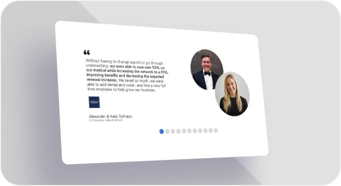 “ Withouthavingtochangepayrollorgothrough underwriting,wewereabletosaveover50%on ourmedicalwhileincreasingthenetworktoaPPO, improvingbenefitsanddecreasingtheexpected renewalincreases.Wesavedsomuch,wewere abletoadddentalandvision,andhireanewfull timeemployeetohelpgrowourbusiness. Alexander&KadyTschopp, Co-Founders,TailoredIndustry
