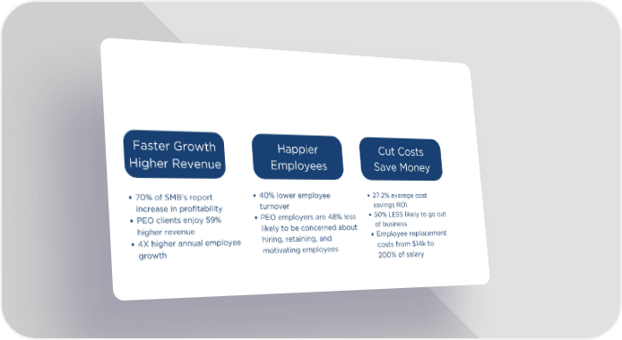 Faster Growth Happier Cut Costs Higher Revenue Employees Save Money 27.2% average cost 40% lower employee 70% of SMB's report savings ROI turnover increase in profitability 50% LESS likely to go out PEO employers are 48% less PEO clients enjoy 59% of business likely to be concerned about higher revenue Employee replacement hiring, retaining, and 4X higher annual employee costs from $14k to motivating employees growth 200% of salary