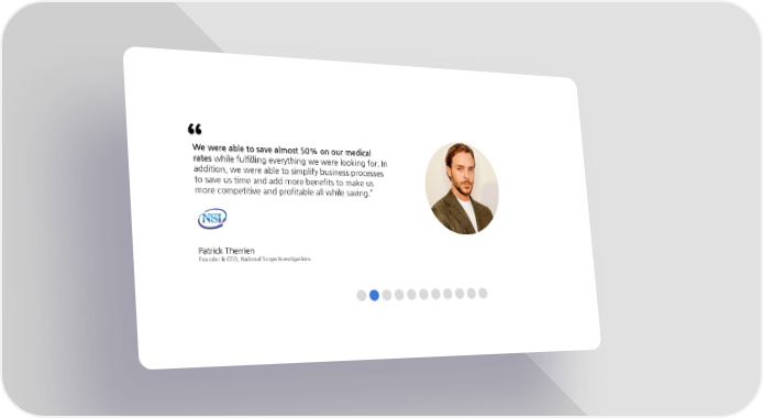 “ Wewereabletosavealmost50%onourmedical rateswhilefulfillingeverythingwewerelookingfor.In addition,wewereabletosimplifybusinessprocesses tosaveustimeandaddmorebenefitstomakeus morecompetitiveandprofitableallwhilesaving.” PatrickTherrien Founder&CEO,NationalScopeInvestigations