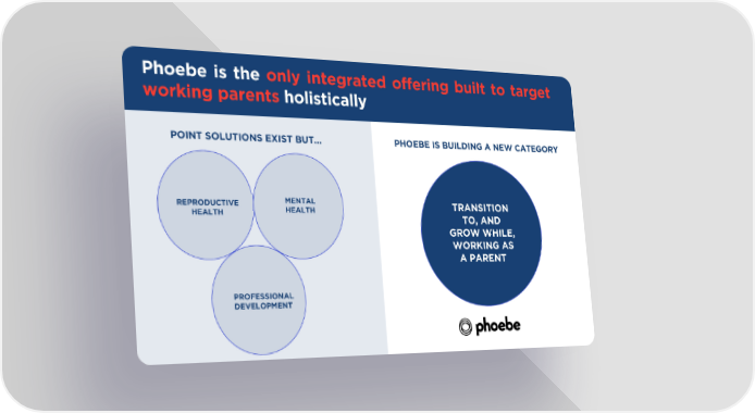Phoebe is the only integrated offering built to target working parents holistically PHOEBE IS BUILDING A NEW CATEGORY POINT SOLUTIONS EXIST BUT… MENTAL REPRODUCTIVE TRANSITION HEALTH HEALTH TO, AND GROW WHILE, WORKING AS A PARENT PROFESSIONAL DEVELOPMENT