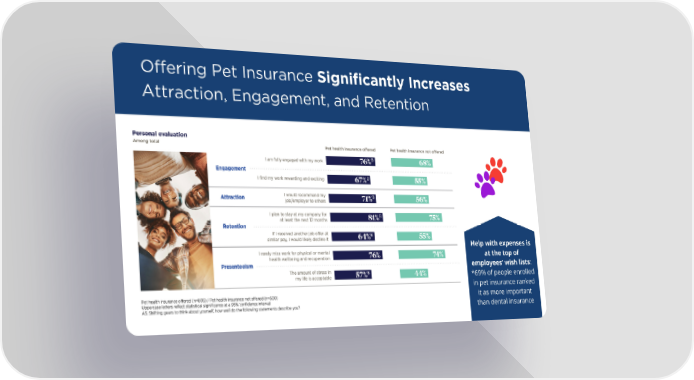 Offering Pet Insurance Significantly Increases Attraction, Engagement, and Retention Help with expenses is at the top of employees’ wish lists: *69% of people enrolled in pet insurance ranked it as more important than dental insurance