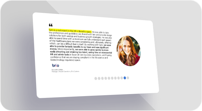 “ SamisarealexpertintheHR+Benefitsspace.Hewasabletotake thepreferencesandguidelineswesharedwithhimandprovidedesign solutionsforbothsavingsandbusinessgrowthstrategies.Hewasalso abletospendtimewithustoensurewefullyunderstandeachaspect ofthehealthcareplanswewereconsideringand,ultimately,offering- which,canbeadifficultfeatinitself.ByworkingwithSam,wewere abletoprovidefantasticbenefitstoourteamandsavesignificant money.Moreimportantly,wewereabletogrowquicklybymore easilyattractingandretainingtoptalent,savingtimeonnonessential HRandadmintasksinfavorofcorebusinessoperations,andhaving confidencethatwearestayingcompliantinthelifescienceand biotechnologyregulatoryspace. JacquelineBellan Manager,PeopleOperations,BrioSystems