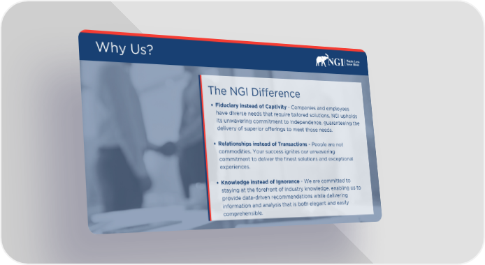 Why Us? The NGI Difference Fiduciary instead of Captivity - Companies and employees have diverse needs that require tailored solutions. NGI upholds its unwavering commitment to independence, guaranteeing the delivery of superior offerings to meet those needs. Relationships instead of Transactions - People are not commodities. Your success ignites our unwavering commitment to deliver the finest solutions and exceptional experiences. Knowledge instead of Ignorance - We are committed to staying at the forefront of industry knowledge, enabling us to provide data-driven recommendations while delivering information and analysis that is both elegant and easily comprehensible.