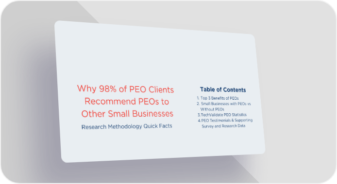 Table of Contents Why 98% of PEO Clients 1. Top 3 Benefits of PEOs Recommend PEOs to 2. Small Businesses with PEOs vs Without PEOs Other Small Businesses 3.TechValidate PEO Statistics 4.PEO Testimonials & Supporting Research Methodology Quick Facts Survey and Research Data