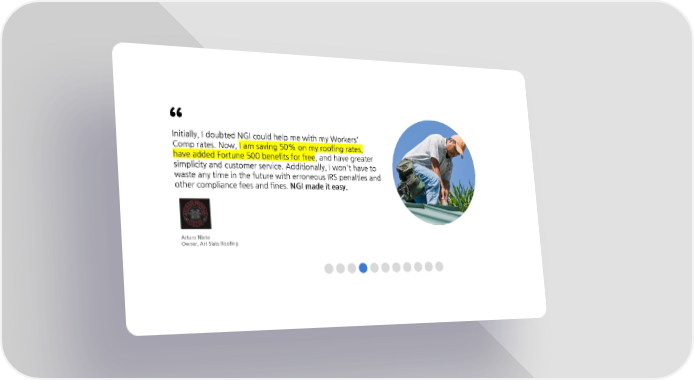 “ Initially,IdoubtedNGIcouldhelpmewithmyWorkers' Comprates.Now,Iamsaving50%onmyroofingrates, haveaddedFortune500benefitsforfree,andhavegreater simplicityandcustomerservice.Additionally,Iwon'thaveto wasteanytimeinthefuturewitherroneousIRSpenaltiesand othercompliancefeesandfines.NGImadeiteasy. ArturoNieto Owner,ArtSlateRoofing