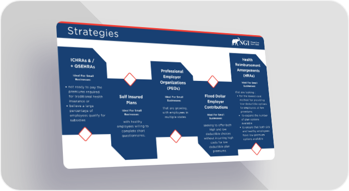 Strategies Health Reimbursement ICHRAs & / Arrangements + QSEHRAs Professional (HRAs) Employer Ideal For Small Ideal For Small Businesses: Organizations Businesses: (PEOs) not ready to pay the that are looking : premiums required for the lowest cost Fixed Dollar Ideal For Small for traditional health Self Insured method for providing Businesses: Employer insurance or low-deductible options Plans believe a large to employees at low Contributions that are growing, Ideal For Small percentage of premiums with employees in Businesses: Ideal For Small employees qualify for to expand the number multiple states. Businesses: subsidies of plan options with healthy available seeking to offer both employees willing to to ensure that both sick high and low complete short and healthy employees deductible choices questionnaires. have low-premium without incurring high options available costs for low deductible plan premiums.