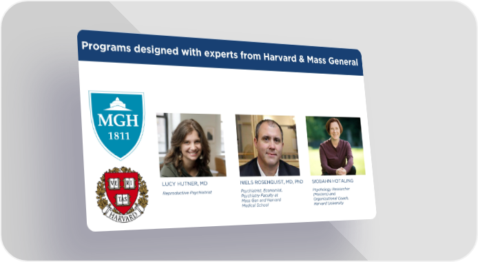 Programs designed with experts from Harvard & Mass General LUCY HUTNER, MD NIELS ROSENQUIST, MD, PhD SIOBAHN HOTALING Psychiatrist, Economist, Psychology Researcher Reproductive Psychiatrist Psychiatry Faculty at (Masters) and Mass Gen and Harvard Organizational Coach, Medical School Harvard University