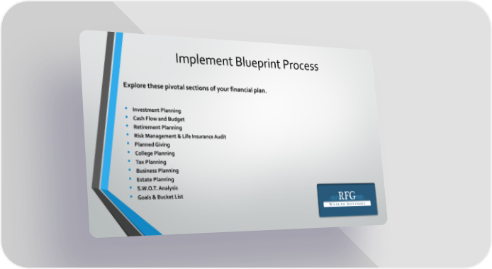 Implement Blueprint Process Explore these pivotal sections of your financial plan. • Investment Planning • Cash Flow and Budget • Retirement Planning • Risk Management & Life Insurance Audit • Planned Giving • College Planning • Tax Planning • Business Planning • Estate Planning • S.W.O.T. Analysis • Goals & Bucket List