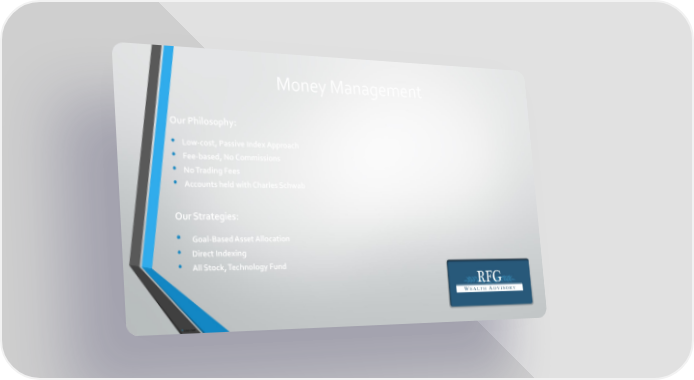 Money Management Our Philosophy: • Low-cost, Passive Index Approach • Fee-based, No Commissions • No Trading Fees • Accounts held with Charles Schwab Our Strategies: • Goal-Based Asset Allocation • Direct Indexing • All Stock, Technology Fund • Low-cost
